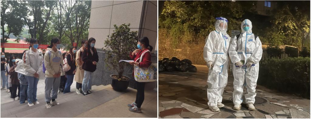 为确保核酸检测有序开展,辅导员们化身成为“检察员”,套上防护服深入员工宿舍“扫楼”,督促每一位员工按时完成核酸检测,确保应检必检,不漏一人。在长长的核酸检测队伍前,他们不辞辛劳、反复强调注意事项。“各位同学,为了你的生命健康以及落实相关疫情防控要求,请保持一米的安全间距,谢谢你的配合。”辅导员杨华俊、张涛自制创意“小蜜蜂”,在员工核酸检测队伍前循环播放注意事项,有声的守护传递着温暖力量。