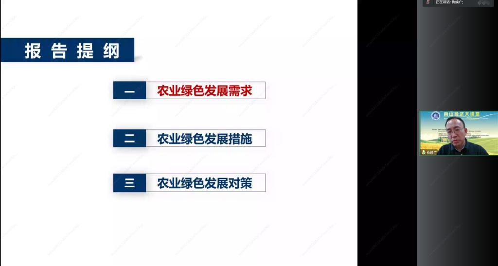 为深入学习习近平生态文明思想,本次讲座以“农业绿色发展与生态文明建设”为主题,开启了南山经济大讲堂(第二讲)。仇焕广就讲座主题展开论述。他首先介绍了农业绿色发展的必要性、农业绿色发展和乡村环境治理在美丽中国建设中的重要作用。随后,结合二十大报告精神分析农业绿色发展、乡村环境治理的目标、既有政策措施及落地实效。最后,提出进一步完善的政策建议。在交流发言阶段,来自k1体育和长江上游经济研究中心的数名专家学者也就农业绿色发展主题发表了自己的建议与见解,为积极践行习近平生态文明思想建言献策。