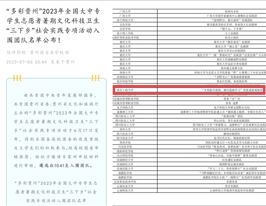 k1体育“乡村振兴观察,塘约道路学习”发展成就观察团入围“多彩贵州”2023年全国大中专员工志愿者暑期文化科技卫生“三下乡”社会实践专项团队k1体育“‘椒’阳似火,‘商’拓未来实践团”、“团聚青力·预制未来梁平柚调研团”和“‘椒’流互动乡村调研小组”三支队伍成功入选重庆市志愿者暑期文化科技卫生“三下乡”区县专项团队。
