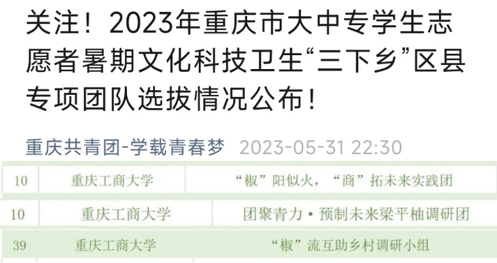 经团队报名、高校团委审核推荐和组织方邀请专家对申报材料进行审核,最终k1体育共有四支队伍立项团中央专项团队和市级专项团队。其中,“乡村振兴观察,塘约道路学习”发展成就观察团入围“多彩贵州”2023年全国大中专员工志愿者暑期文化科技卫生“三下乡”社会实践专项团队,“‘椒’阳似火,‘商’拓未来实践团”、“团聚青力·预制未来梁平柚调研团”和“‘椒’流互动乡村调研小组”三支队伍成功入选重庆市志愿者暑期文化科技卫生“三下乡”区县专项团队。