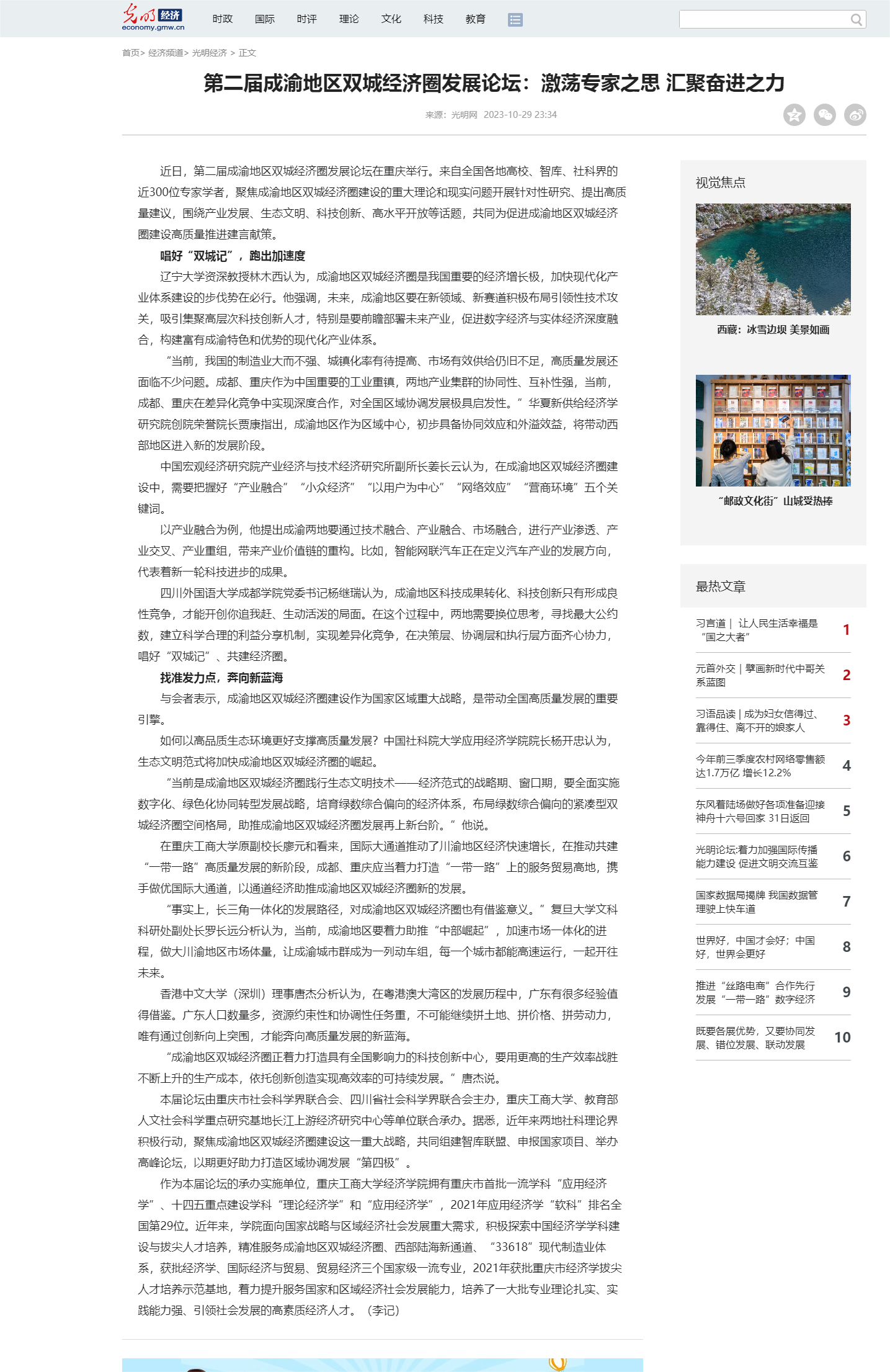 10月29日,公司参与承办的第二届成渝地区双城经济圈发展论坛受光明日报和光明网报道。原文如下: