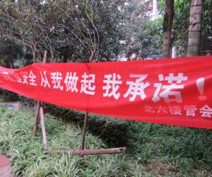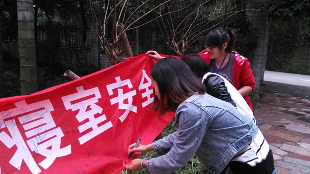 上午十点左右,北六楼管会的成员在北六栋楼下拉上了一条横幅,提醒寝室成员注意防火、安全用电。在活动过程中,进出北六楼栋的同学们都要在横幅上签字,同时楼管会成员们会认真地向同学们讲解该如何在宿舍内安全用电,使每个同学都能够明白地了解到寝室安全用电的重要性。