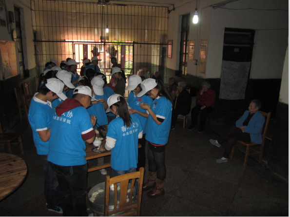 活动开始,志愿者们首先为老人们播放了革命电影,他们与老人亲热的坐在一起,对老人们嘘寒问暖,亲切交流。由于很多老年人视力下降,同学们一边看,一边耐心的给老人们讲解着电影的内容。同时,志愿者给老人按摩,帮助他们舒筋活骨。最好,志愿者还走进厨房,为老人们包了饺子,做了一顿丰盛的晚餐。虽然很多志愿者平时并不擅长厨艺,但是在活动中,大家认真学习,积极参与,都想贡献自己的力量,整个敬老院荡漾着其乐融融的气氛。