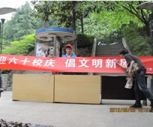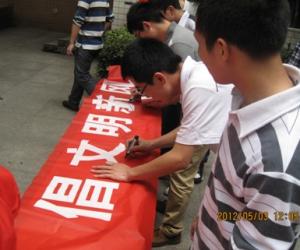 2012年5月3日中午12时,北二十一栋楼管会及党员服务站成员来到北21栋楼下,向楼栋同学宣传《文明修身倡议书》和经济贸易公司老员工文明修身行动实施方案的相关内容,并邀请楼栋同学在横幅上签字。同学们在横幅上写下的一笔笔,都是有着对校庆的祝福,对自身文明修身的承诺。由于活动参与人数众多,活动氛围良好,活动过程中还吸引了周边楼栋的其他公司同学以及部分登山路过的人员。
