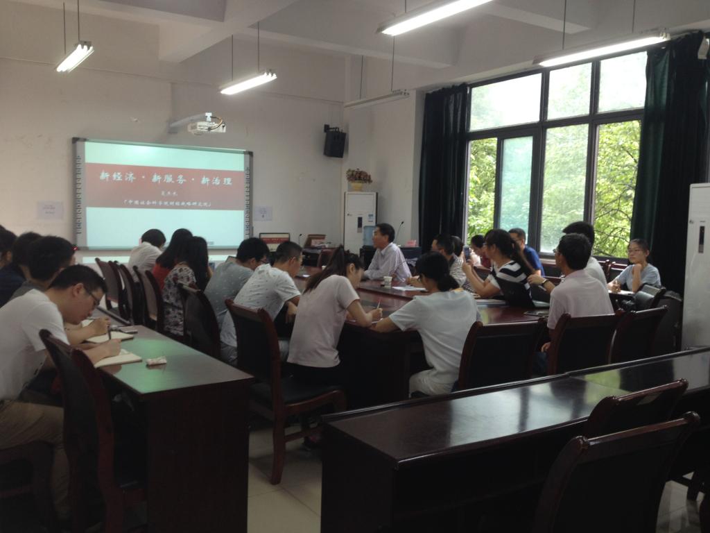 夏杰长研究员在k1体育404会议室为公司教师及2015级研究生做了题为《新经济.新服务.新治理》的学术报告。夏杰长对“新经济”一词作出了深刻定义,从要素投入、生产方式、行业范畴等方面对新旧两种经济的差异性做出了对比和判断,提出在中国劳动、资源和资金短缺的情况下,中国经济必须寻找“新动能”:技术进步、消费升级和放松管制等。同时,“新经济”需要“新治理”, 夏杰长认为,在“新经济”日趋成熟的当下,应秉持包容试错与政府监管相结合的理念,既要用开放的态度积极对待新经济的发展,又要加强监管,保证其平稳有序健康发展。