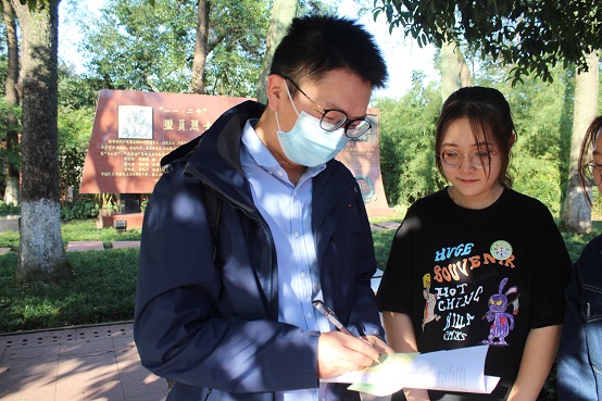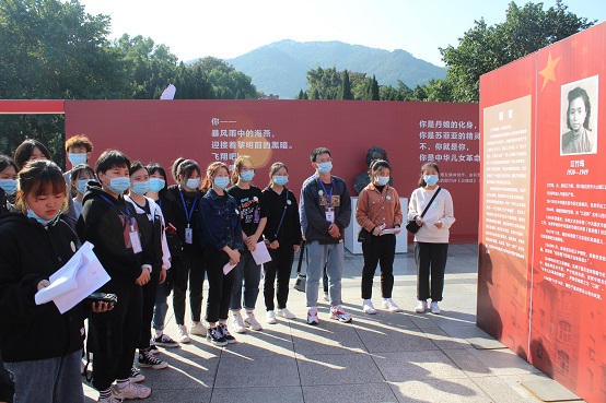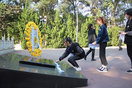 活动中,志愿者们依次在园内各烈士碑前详细地向大家讲解了革命烈士的生平信息。在志愿者们的讲解中,烈士碑前仿佛回到了血雨腥风的战争岁月,再现了中华民族的优秀儿女们为了争取民族独立、国家解放,不惜抛头颅洒热血的场景。接着,怀着无比沉重的心情,志愿者们来到烈士墓前,向英烈们献上了表示怀念和哀悼的花圈,并集体向英勇牺牲的烈士们默哀三分钟。默哀完毕,全体肃立,志愿者们庄严地在墓前进行宣誓,雄浑有力的声音久久回荡在墓前。暖阳斜照,金秋时日,许多游客也不禁驻足,凝望着志愿者们庄严肃穆的模样。