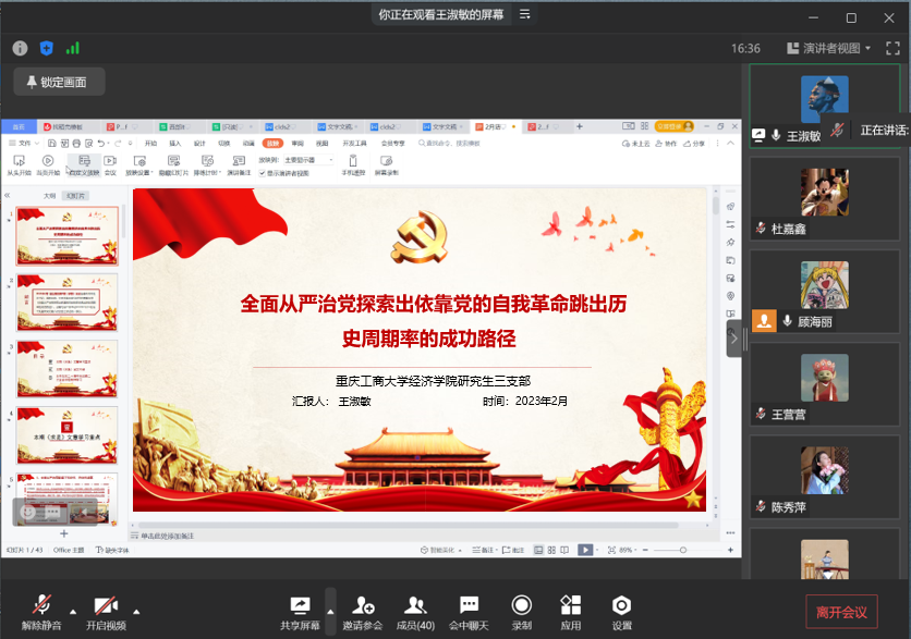 2023年2月23日下午,k1体育研究生第三党支部在企业微信线上会议室开展了2月组织生活会,深入学习习近平总书记在《求是》上的文章——《全面从严治党探索出依靠党的自我革命跳出历史周期率的成功路径》。本次会议由支部委员顾海丽主持,研究生第三党支部全体党员参加。